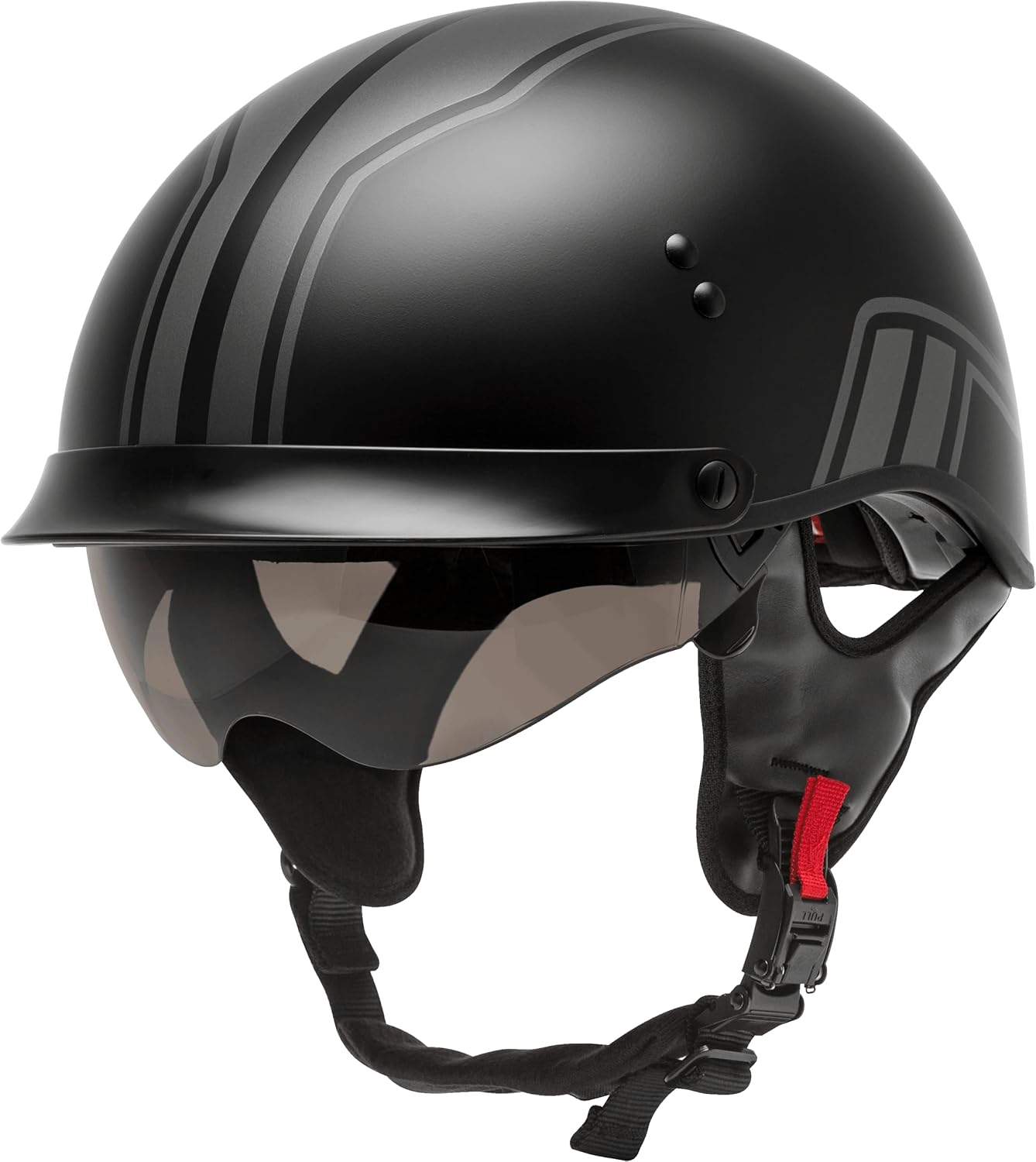 Designed to provide a modern, low-profile look while delivering safety, comfort and convenience - the GMAX HH-65 Half-Helmet is an essential piece of gear for any motorcycle rider, touring biker, or scooter rider. Featuring a moisture-wicking liner that allows for maximum venting and a quick-release chinstrap buckle, this half-helmet is built for comfort so you'll want to wear it every time you hit the road. Designed for safety, this helmet is DOT-approved so you can wear it on back roads, mountain passes and highways. With this order you'll receive 1 HH-65 Half-Helmet, 1 smoke and 1 clear retractable UV400 sun-resistant shield and a removable snap-in neck curtain with speaker pockets. It features a removable, washable interior which allows for easy cleaning so you can keep your helmet fresh and comfortable. Don't settle for a bulky helmet with an uncomfortable interior and questionable construction. The GMAX HH-65 Half-Helmet provides all the safety, comfort and features you need in a motorcycle helmet. With many different sizes and color options available, you can find a helmet for every rider in your family. Get out and ride your favorite nature routes, back roads, or scenic highways—the HH-65 helmet provides the comfort and safety you need. This half-helmet provides a clean look and sleek design so you can look good and ride in style. Owned and operated by motorsports enthusiasts, GMAX Helmets provide safety gear that racers, commuters and hobby riders can rely on. Whether you need a helmet for the pavement, dirt or snow - GMAX Helmets have what you need.