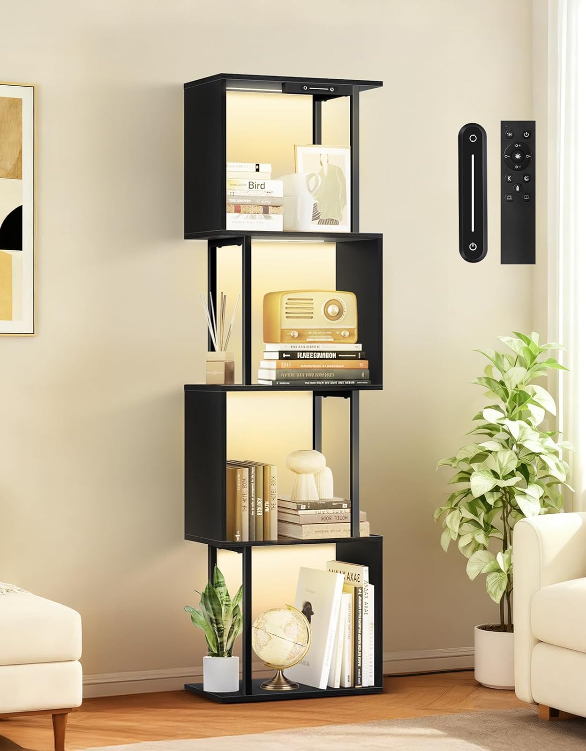 • Built-in LED Lights, Perfect Integration of Bookshelf and Floor Lamp: This S-shaped bookshelf combines ample storage with built-in LED lighting, offering 3 adjustable color temperatures (warm white, natural white, cool white) and stepless dimming(10%-100%). Perfect for reading, relaxation, or night-time use, the 1-hour auto-off timer and memory function ensure the light always returns to your preferred setting, providing a customized and convenient lighting experience.