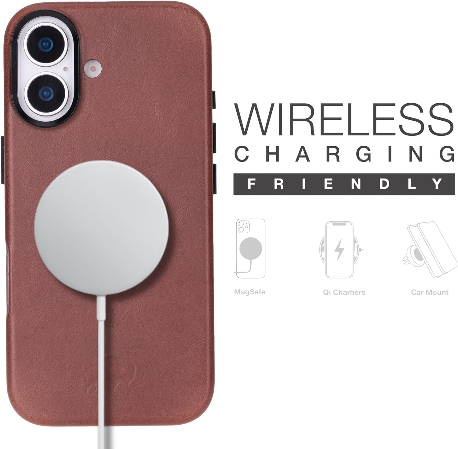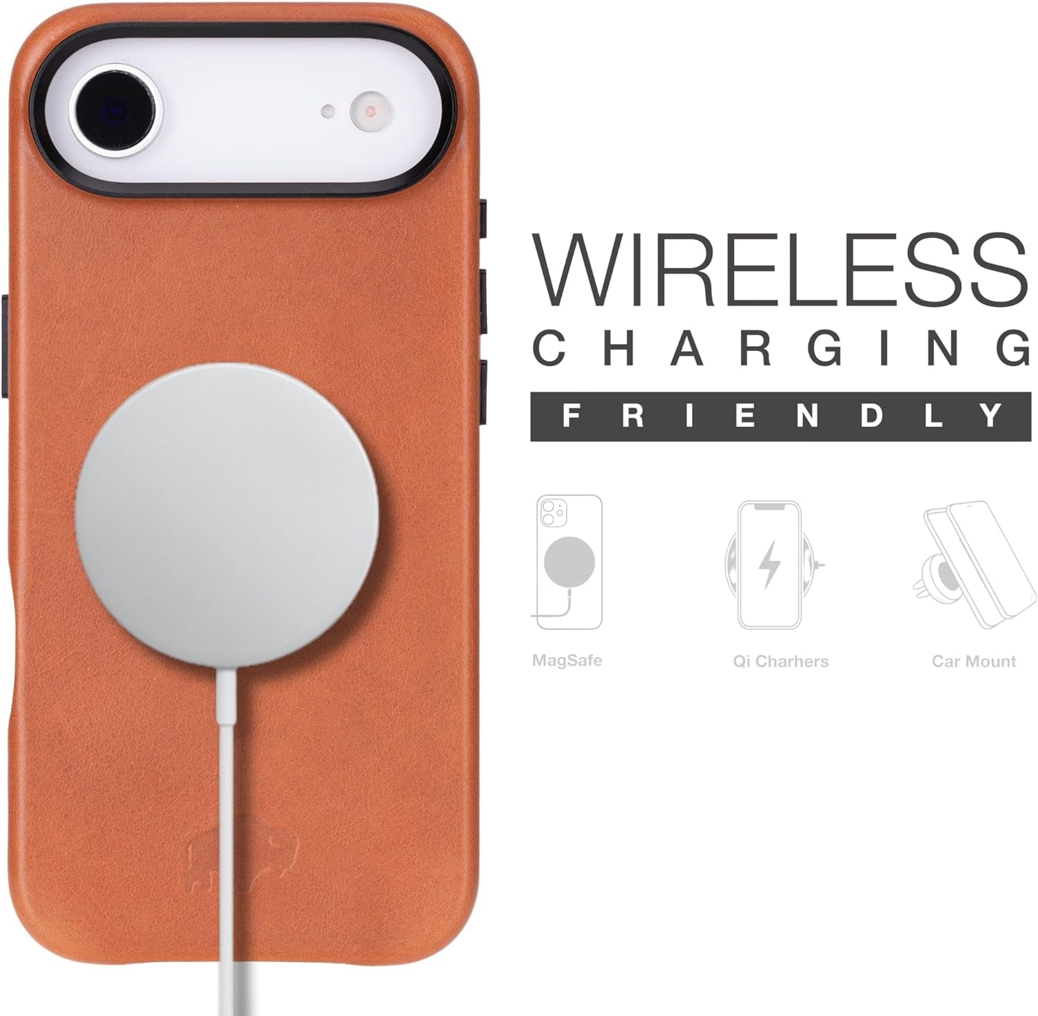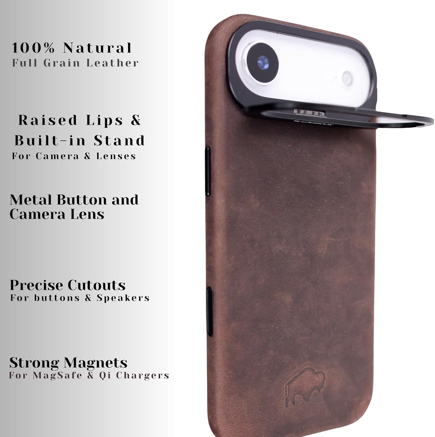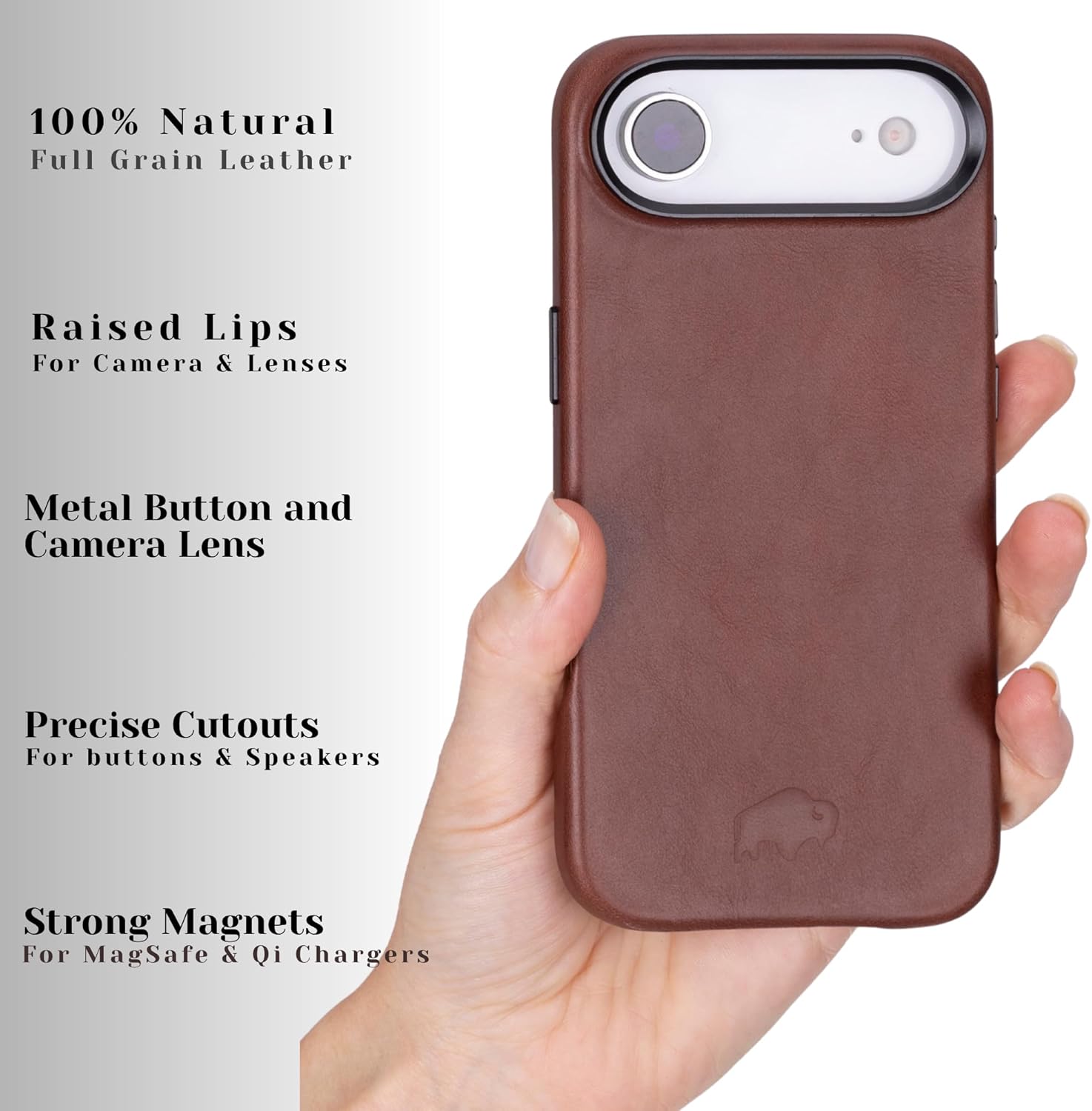 | Additional Features | Full-Sided 360° Coverage, Handcrafted Full Grain Leather, Metal Camera Ring Protection, Soft Microfiber Interior, Wireless Charging Compatible |