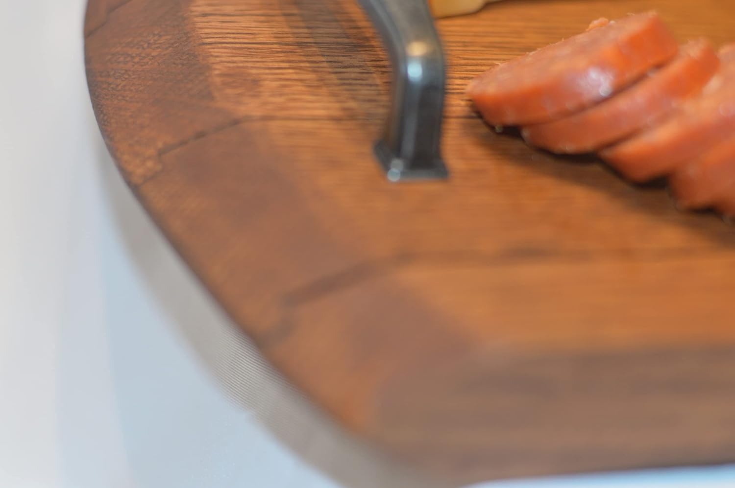 This serving tray was made from a Bourbon Whiskey barrel lid. It is 100% solid American white oak. This is a sturdy heavy duty piece. The handles are a beautiful type color. Perfect for your next wine and cheese party. Use if for you whiskey tastings. This is a surefire way to class up your kitchen. Each barrel lid is different so the width will vary a bit from piece to piece. Approximate dimensions are: 21 inches long 12 inches wide 1 inch thick