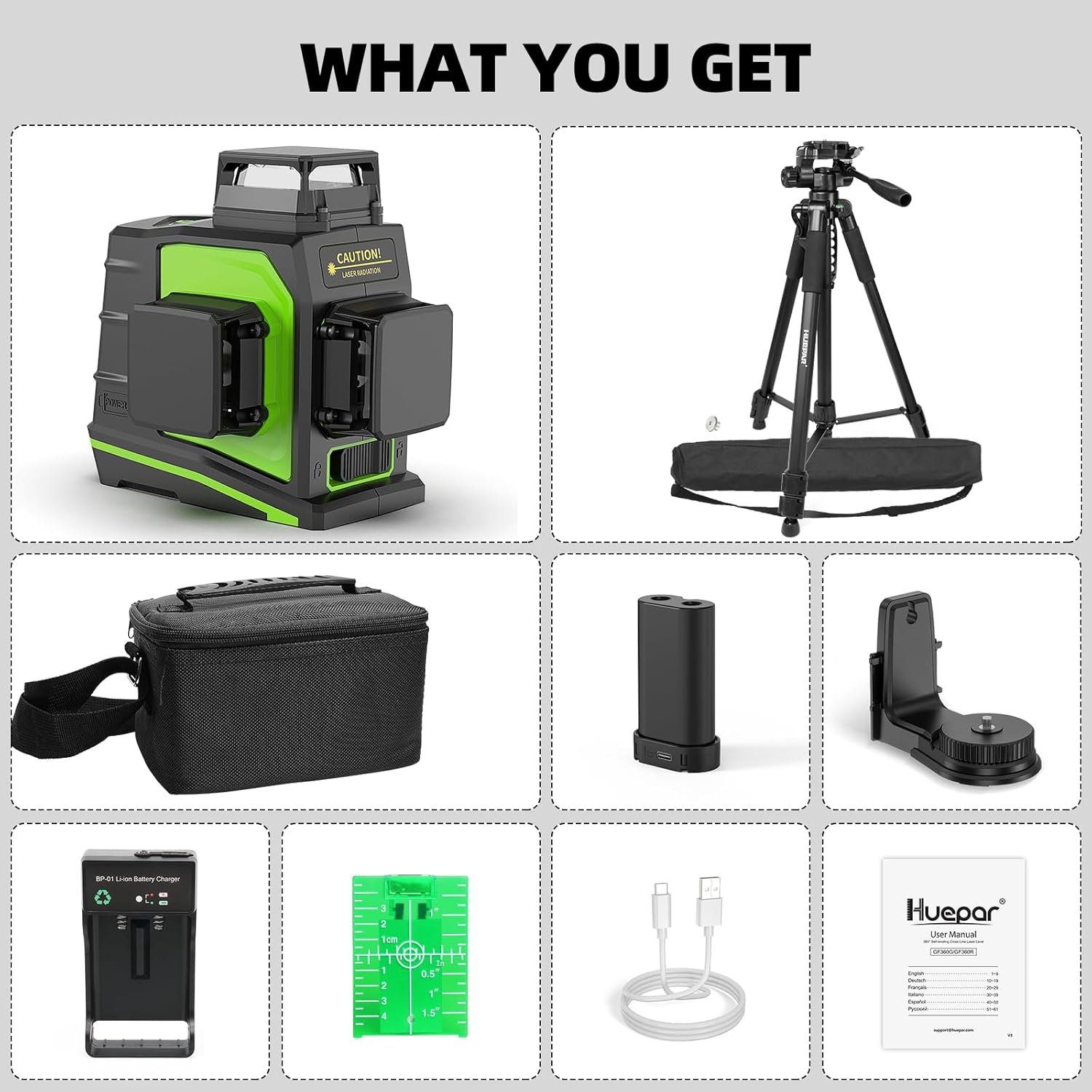 Huepar GF360G 3D Laser Level 360 Self Leveling with 67.72" tripod, Laser Class: Class 2 (IEC/EN60825-1/2014), 1mW power output